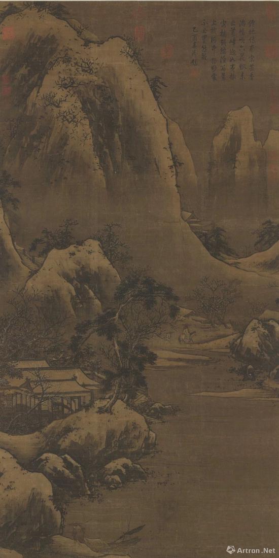 马远,因其画面常绘一角,人称“马一角”。但这幅画不同马远的经典图式,而是采用全景构图,画面由近及远层层推进,万嶂中有屋舍数间,身份迥异的5人分列画面位置。画家用笔苍劲,力而有韵。墨色淋漓多变,意境浑厚。