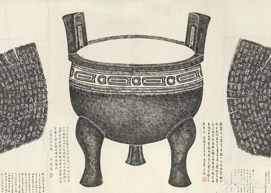 毛公鼎为西周晚期毛公所铸,清道光末年出土于陕西,铭文达499字,记载了毛公衷心为国献策之事,是金文(钟鼎文)中的经典名作。全作书写精谨,线条凝练,字形狭长,疏密有致,带有古朴风格。