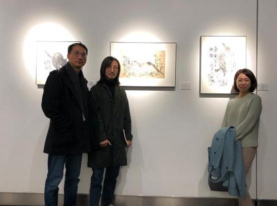 朱新建艺术展现场,右起:作者黄朋、丁健飞、顾村言