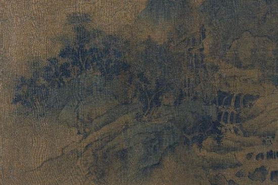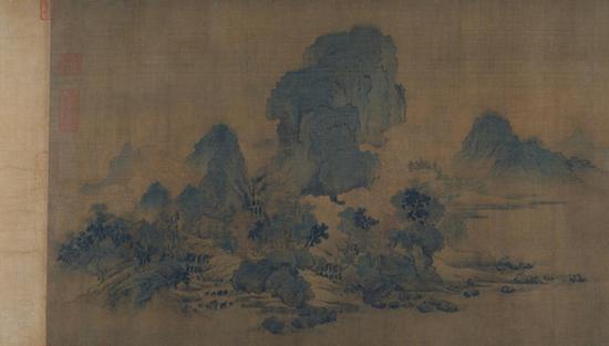 王诜(1048一1104),字晋卿,太原(今属山西)人,居开封(今属河南)。尚蜀国公主,官驸马都尉。常与苏轼、黄庭坚、米芾等人往来,是北宋末重要的收藏家,也是著名画家。画山水远法李思训父子,善作青绿山水,近学李成,好写幽谷寒林、平远山水。本幅绢本,青绿设色,山石用浓墨勾勒,方笔皴斫,树法间以夹叶、点叶,云气空勾回环。