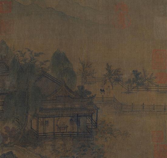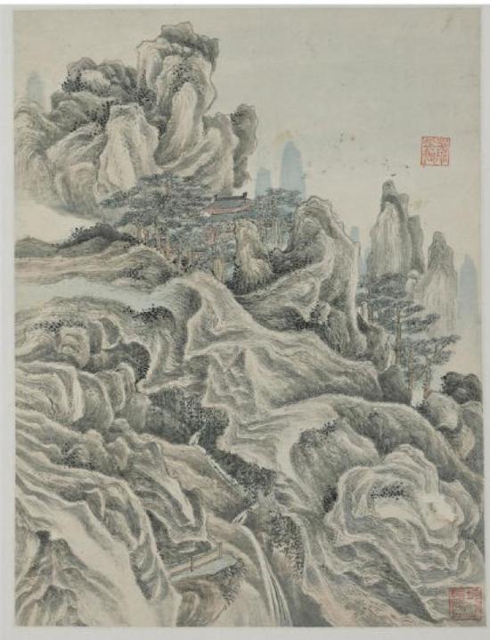 本册画十开,水墨、设色各占四、六,用笔精洁,设色淡雅,勾廓擦染,尤具典型。画中寂静山林楼阁屋宇之间偶有人物、舟车、驮马点景,有 “自得之趣”。