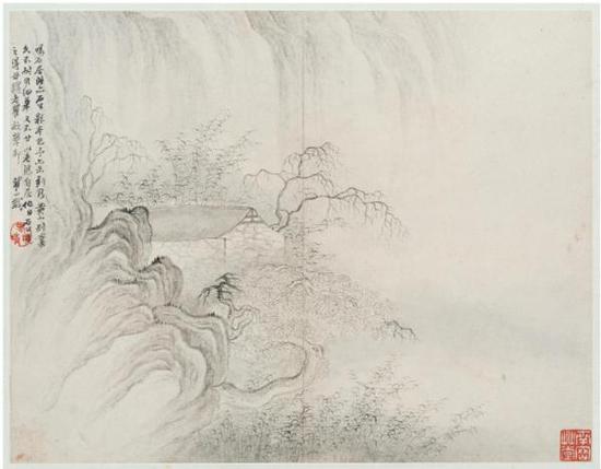 恽寿平(1633—1690),原名格,字寿平,后以字行,改字正叔,号南田,别号云溪外史,武进(今江苏常州)人。本幅作于康熙十一年(1672),作者时年四十,是其山水创作较多的时期,四十五以后则多作花卉,山水相对少见。此幅绘古木乔柯、脩竹柔草,远处山峦回环,下临溪谷,有轻烟笼罩。自题“学曹云西法”,即元代画家曹知白。所画山石折带皴法、树法颇似,却不失自己秀逸的本色。曾经吴湖帆收藏,裱边吴氏题云“用笔则软若游丝,劲如屈铁,是所谓绵里藏针。”可谓的评。