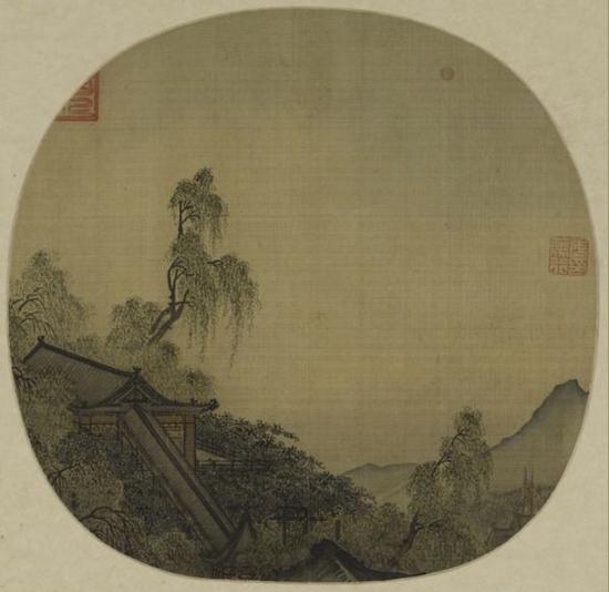 本页绢本设色,绘远山近水,园池水阁。水阁内摆设屏风、圆凳、交椅、几案,主人临窗而坐,隔扇都已撤去,以便纳凉、赏荷。水阁连接平台折檻,两名童子在树下摘花,一人攀折,一人承接。画中建筑物规格较高,斗拱、屋檐都很华丽,应当是贵家所有。整幅展现宋人消夏场景,布局舒朗,画法精妍,近似南宋院画作品。