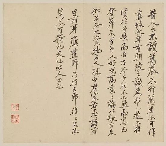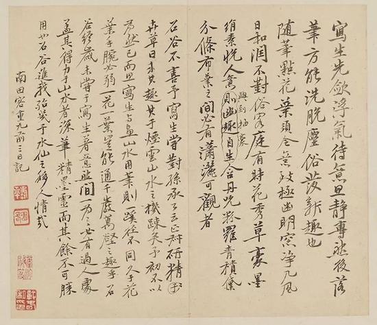 恽寿平(1633—1690),原名格,字寿平,后以字行,改字正叔,号南田,武进(今江苏常州)人,为“清初六大家”之一。擅画花卉、山水,书法亦冠绝一时。此册为恽寿平诗文集,多有为王翚所书,并有重要画论。其内容对研究恽寿平有着重要价值,应是他当时自抄的稿本。恽寿平书法清俊秀逸,深得王献之、褚遂良书法神韵,称作“南田体”,却常被他的绘画与诗文成就所掩,其身后书风随着没骨花广为流行。此册用笔圆润秀婉,点画精美多变,结字起伏跌宕。其高洁脱俗之气溢于楮墨之间。此册为首次进入书法馆常规展陈列。