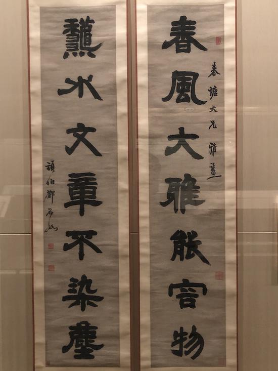 上海博物馆历代书法馆位于三楼,是国内完整呈现历代书法真迹的常设展厅,系统展示了从商代到清代的中国书法艺术历史轨迹,呈现了“篆隶行草楷”的各种书体,展框、自动感应的灯光照明和历代书法精品的巧妙结合,有着浓郁的墨香。澎湃新闻记者在现场看到,进入展厅,上博董其昌大展留下的“画禅室”仍在,董其昌的对联“宇宙在乎手,万化生乎身”配以多媒体呈现的宋徽宗花鸟画作,一片灵动与书香的氛围。
