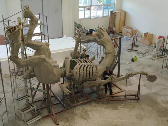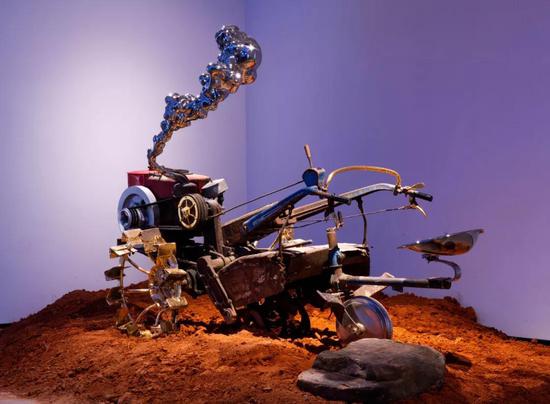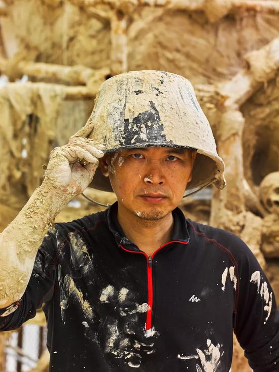 当今世界风云变幻,冲突四起,天下并不太平,曾经的黑夜随时可能再度降临。于是,我根据北京民生美术馆既有的大台阶倾斜度,采用魔幻现实主义手法建构了一个没有独立思考能力,同时又极其渴望晋升,服从上级,善恶无分的“功臣斗士”心中欲立的丰碑轰然倒塌的悲惨场景;同时,人物手中的枪挪用转化了联合国大厦前象征平和的打结左轮手枪的艺术语言;而连根拔起的作品基座顶部营造的则是一个动物世界的伊甸园,隐喻着人们应当相信人类终将能够战胜邪恶实现理想的正义,走进那流着奶和蜜的梦中之境。试图寄望作者和绝大多数公民反对战斗,向往和平的美好心愿和诉求。