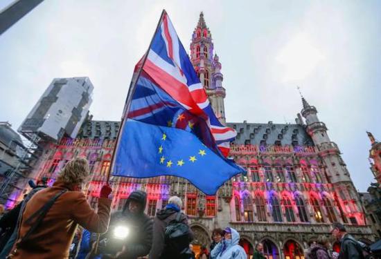 一位女士高举英国国旗和欧盟旗帜,图片来源:Stephanie Lecocq