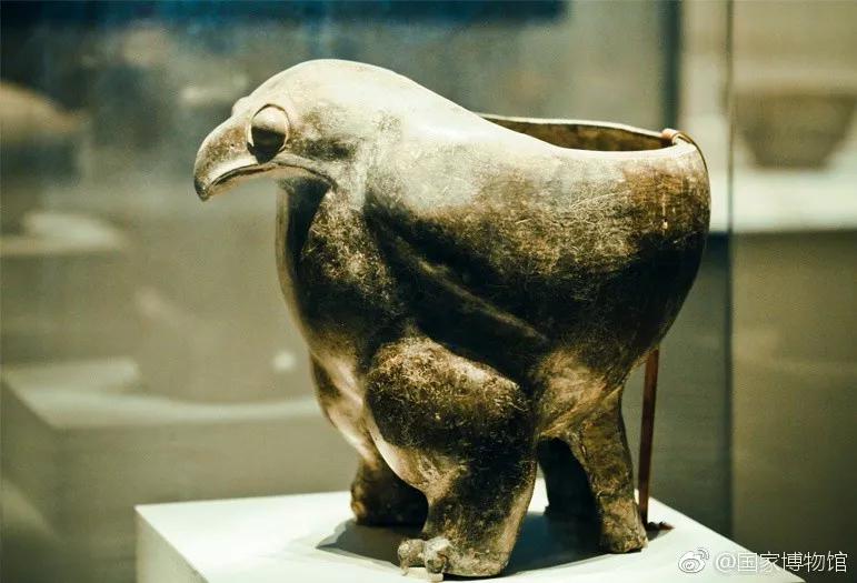 鹰形陶鼎属于新石器时代仰韶文化的器物,是一个将艺术与实用功能完美结合的典型例子。陶鼎呈灰黑色,通体打磨光滑,整体形态采用一只伫足站立的雄鹰造型。鹰嘴坚硬有力,两眼突出。鹰体丰满健硕,双腿粗壮刚劲,两翼贴于身体两侧。尾部下垂至地,与两只鹰腿构成三个稳定的支点,撑起整个鹰体。鼎口设于鹰背部与两翼之间,作简单的圆孔状,以鹰前胸兼作鼎腹,外形饱满粗壮。