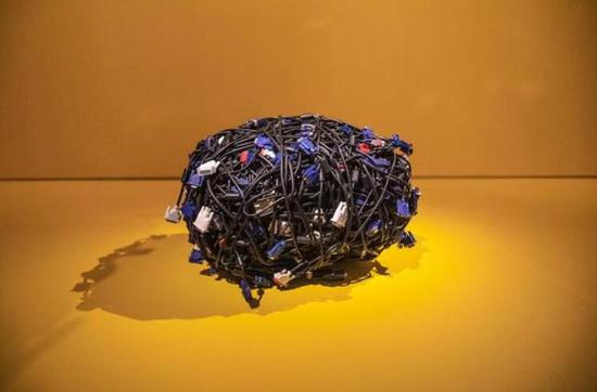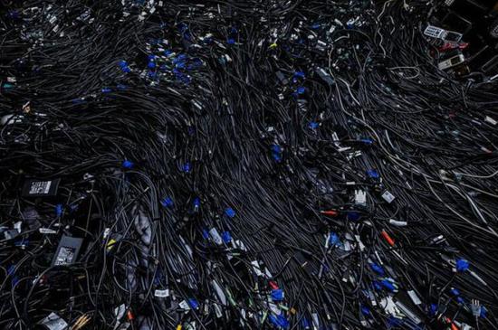 手机形成的假山就像岛屿一样从盘旋的黑色电脑线缆的海洋中升起。数英里长的电脑线缆密密麻麻的捆扎在一起形成了一个球体。