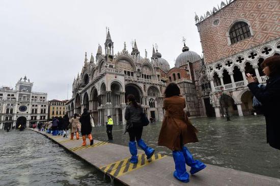 2019年11月15日,行人穿行在洪水中的圣马可广场。新华社 图