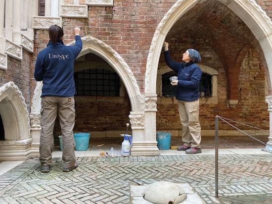 工作人员在卡·多洛金屋(Ca’d’Oro)内部庭院修复石雕 Photo: courtesy of Unisve