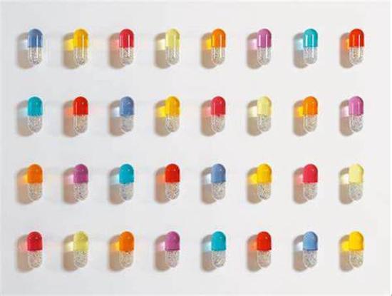 正是在2014年伦敦“Schizophrenogenesis”个展上,达明安·赫斯特假艺术之名,推出了一系列造型的药片。上千颗胶囊与药片,整齐地排列在展框内,每一粒都美丽、可爱。虽然,艺术家并没有介绍每一颗的药效,但不得不说这间“药房”对于“患者们”是一次视觉上的享受。
