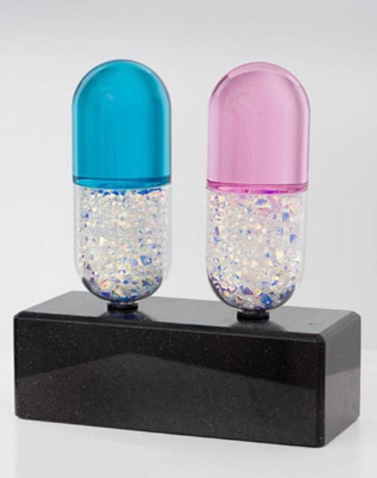 使用医药元素创作的,还有意大利新波普艺术家毛罗·佩鲁切蒂(Mauro Perucchetti),他的作品向来靓丽又光鲜。胶囊和针管内不再只是医学药物,而是华丽的填充物,成为一剂昂贵的强心剂。