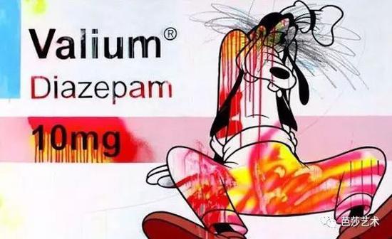 作品中出现的字母,例如“Valium”是西方很常见的一种药品,即安定,成人失眠、患病需镇静时常用此药。另外,“Pfizer”,是世界制药业巨头,他们的产品覆盖了包括化学药物、生物制剂、疫苗、健康药物等诸多领域,研发和生产能力均处于全球领先地位。赫斯特本人这样形容药片:“它们是艺术小精灵,造型简约、抽象,服下之后药到病除,可以神清气爽、拥抱美丽每一天!”