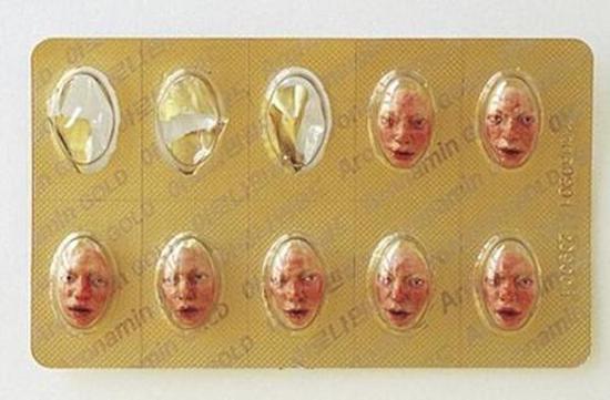 韩国艺术家李东昱(Dongwook Lee)的“人脸药丸”则让人感到惊悚和诡异。李东昱对与人类这一典型的生命体相关的有机生命体有着浓厚的兴趣,他的小雕塑通常为裸体人像,身处某种极端无助的环境及情境。有观众表示,病人若是看到“人脸药丸”,可能会吓到病情加重。艺术家希望借这些作品表达,生长在拥挤都市中的人们,一生病就用打针、吃药来解决问题,有时看上去,就跟这些玩偶一样。他创作的玩偶大都极其惊悚,表情、动作诡异,也由于制作极为逼真,所以引发许多舆论争议。