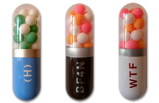 Edie Nadelhaft将最热的英文网络用语印在“胶囊”上,比如有“TTYL”、“NSFW”、“IMHO”,意为Talk To You Later (一会说)、Not Safe For Work(不适合上班时间浏览)、In My Humble Opinion(恕我直言)。