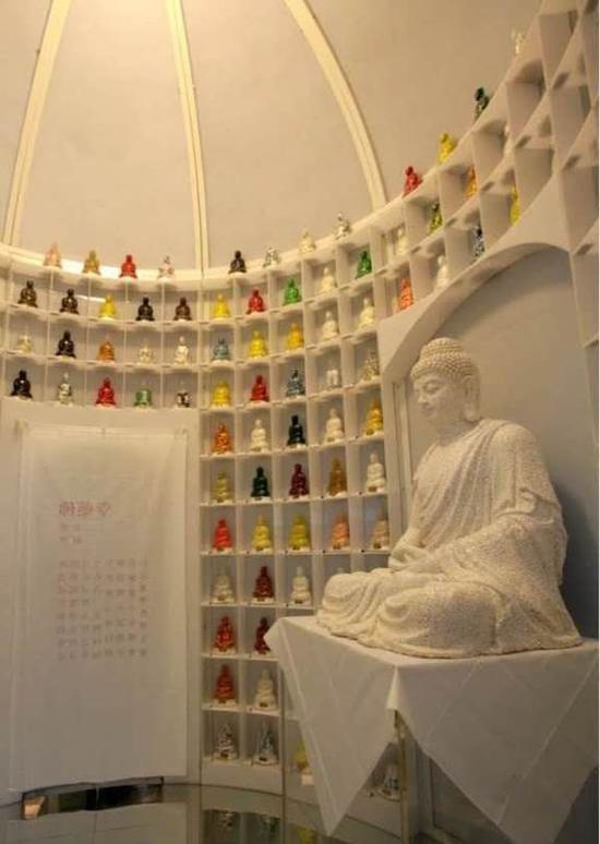 在2006年上海双年展“超设计”中,有一件北京艺术家展望的《佛药堂》,他把佛与药联系在一起,变成佛药合一。在《作品简述》中,艺术家说:“《佛药堂》既为佛堂,又为药堂。医心医身,见心见性;人性之本,身心合一。见佛即得,可谓佛中有药,药中有佛。药生之处,佛性即生也。现在生活中肉体和精神已经分离,就好比宗教给予人精神上的慰藉,而药则治疗肉体的疾病。如果药品和宗教能合一,也许才可以治疗这个社会。佛身都是由西药拼合而成的,一个是治疗心灵的药,一个是治疗身体的药,象征精神与物质的统一。”