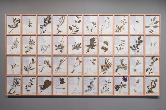 在这些作品的周围,采集自四川各地的草药标本如同绘画一样被装裱和排列,悬挂在一面墙上。
