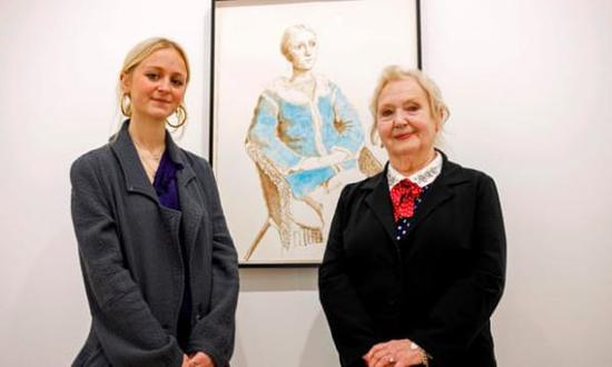 伯特维尔和她的孙女斯嘉丽·克拉克在大卫·霍克尼画的斯嘉丽肖像旁合影。