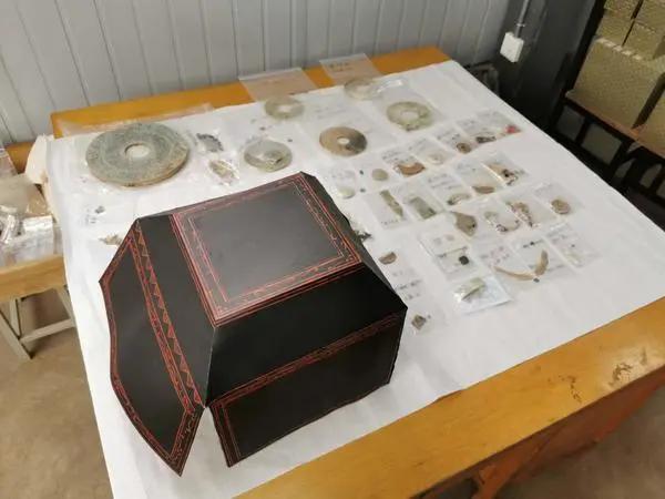 “它类似于一个方形的盒子或者说是桶,一面开口,类似于我们现在的头盔、头罩一样戴在死者头上,在开口的那一面还有一个类似于帘子的结构。表面用玉片覆盖,并在对应着死者面部、头顶部、左耳、右耳的面镶嵌玉璧,然后面部的那个玉璧中间放置一面铜镜。”潘付生拿着复原模型向记者解释道。