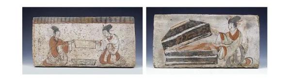 两汉、魏晋以来的河西女红,在甘肃高台壁画墓出土的画像砖中得以非常具象的体现。剪布图画像砖边缘黑红两色绘屋檐,下绘跪坐二女用手共扯一织物,织物下方置蓝奁。左边女子右手持一长剪,似正准备剪布;开箱图画像砖右侧为一女子,跪坐于地,一手打开左侧的箱盖,一手从箱中拿取衣物。箱子表面施墨,上面画有白色的横线,在黑色的部分上画有朱色的图案。图像写实,生活气息浓厚,正如邻家妇人裁衣制裳、点检衣物。