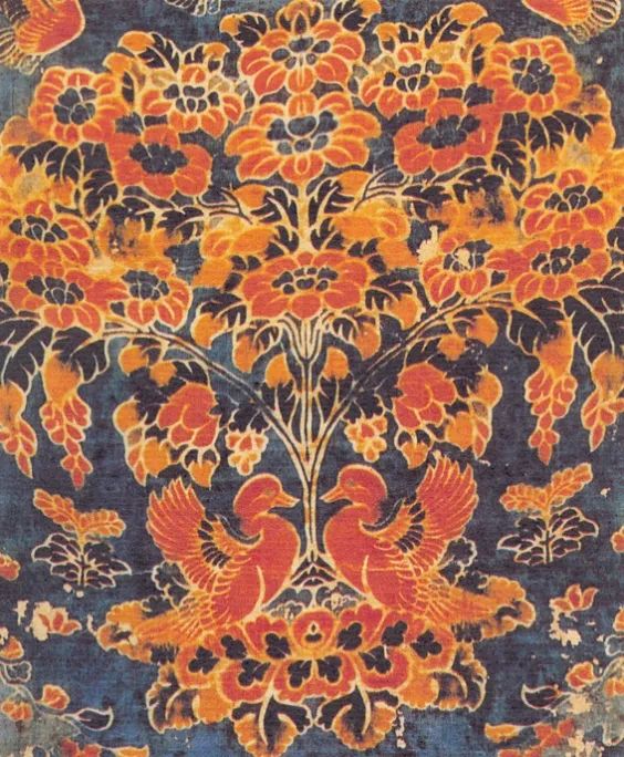 夹缬始于唐也胜于唐,在吐鲁番,敦煌均有五彩夹缬出土。歌咏夹缬的唐诗也有不少,“成都新夹缬,梁汉碎胭脂”,“醉缬抛红网,单罗挂绿蒙”等。到了宋辽时期,仍然有不少夹缬生产,目前有山西应县佛塔出土的南无释迦牟尼佛夹缬绢以及内蒙古辽庆州白塔发现的夹缬罗。明清的夹缬出现在包袱布或唐卡覆面上,似乎来自于西藏的制作。