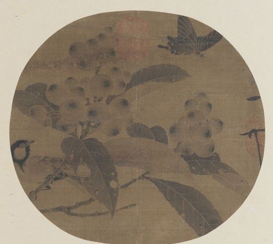 宋徽宗赵佶以工细逼真的双钩花鸟画著称。他重视写生,画派结合了多种风格。亦擅书法,自称“瘦金书”。在位时亲自掌管翰林图画院,以广收历代文物、书画扩充藏品。《枇杷山鸟》(团扇,绢本,墨笔,22.7 x 24.7,北京故宫博物院藏。)沿袭了徐崇嗣的“没骨法”(徐崇嗣,南唐画家。徐熙孙。擅画草虫、禽鱼、蔬果、花木等。其画初承家学,因不合当时图画院程序和风尚,遂改学黄筌、黄居寀父子。后又自创新体,所作不用墨笔勾勒,而直接以色彩晕染,世称“没骨图”,也称“没骨花”。),画的左下角画一只玲珑的山雀歇在树上,透过叶间丰美的枇杷,回望轻盈的飞蝶, 墨染的枇杷,情调特别秀润,而墨彩流动、细腻,一种文静的气氛,弥漫在形象的描绘中,通过这种气氛流露的生动性,充满了亲切的、动人的情感。