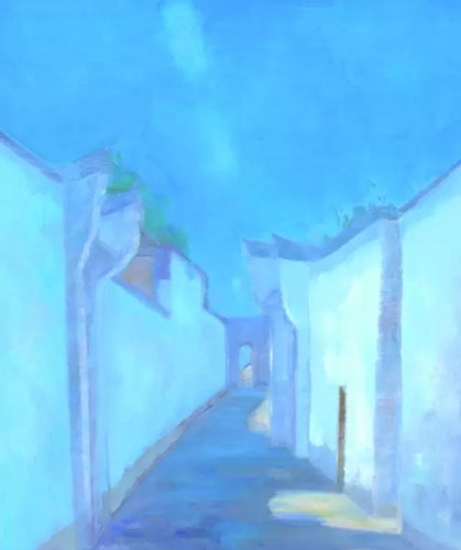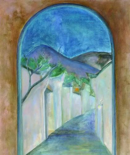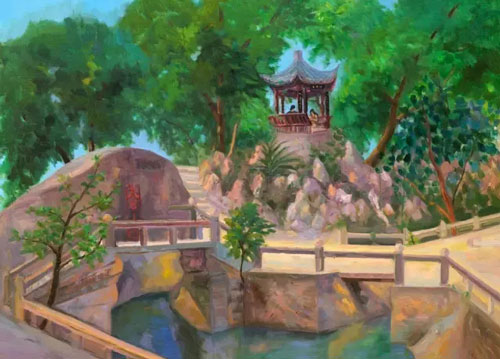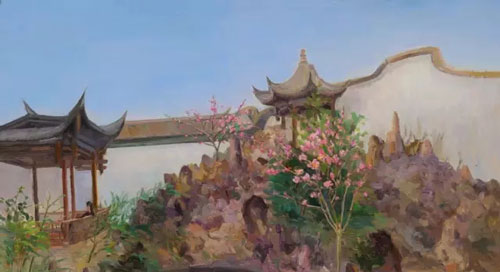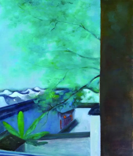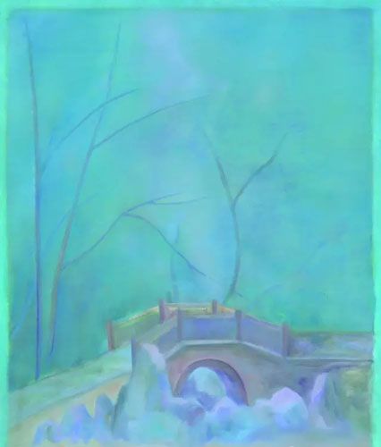 细看他的风景画,就会马上发现人物在其中几乎不占据任何地位,幅幅都是无人的风景画。风景画中的人物其实扮演着远不容忽视的角色,浪漫主义风景画家弗烈德烈希(Caspar David Friedrich, 1774-1840)的人物在引导观者的视线,揭露渺小人类面对大自然崇高美感时内心的震颤;而巴比松画家鲁索(Théodore Rousseau, 1812-1867)的无人风景画,则是隐喻作者的自然主义哲思。同样的,冯巍描写的并非蛮荒的自然,而是本当有人的人文景色,如果冯巍只想让晴空浮云、坊桥巷弄、湖光塔色等等风景元素说话,那么他让这些元素构成的,也就不仅仅是风景的“再现”(representation),而是风景的“幻化”(metamorphose)。