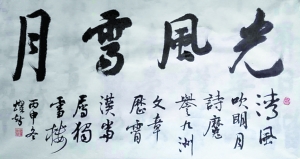 光风,是指雨后初晴的清风,霁月,是指暴风雪过后的明月,万物明净。古今中外许多历史人物多用这四个字来形容世事无常,但最终是历尽沧桑后,始见人生的彩虹,此也成为亘古不变的大道。用在洛夫先生的身上也很贴切。清风吹明月:雨雪之后的清风明月;诗魔誉九州:七十余春秋的笔耕,获得诗魔的尊称,誉及海内外;文章历霄汉:洛老的诗歌文章,翻译成多国文字,在全世界传扬:当属独雪楼:美妙犀利幽默激扬的诗文都来自于雪楼斋(洛老的斋名)