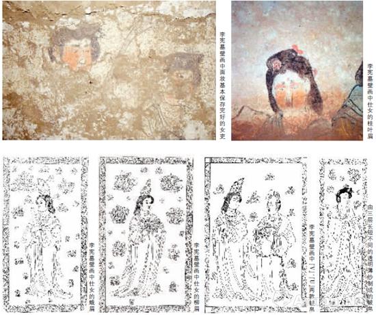 唐李宪为睿宗皇帝嫡长子,2000年考古发掘结束,墓中出土大量壁画及庑殿式石椁一具,李宪墓壁画及石椁线刻中表现最多的是仕女人物,她们形体丰腴,姿态婀娜,面庞娇美,其面妆、饰品均是当年时尚的充分体现。