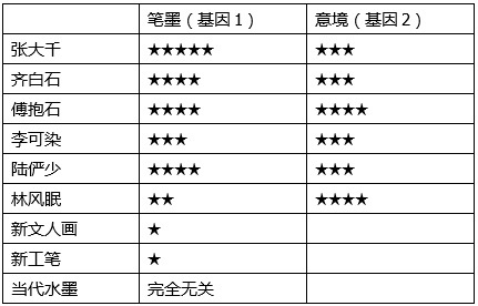 我做了一个表格,把一些名画家与中国画水墨的二个基因标准作比对,也许从中可以看出一些端倪。(当然这些纯属我个人看法)。