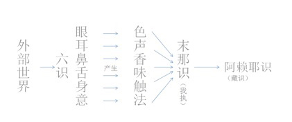 简单地说,人通过前六识,从外部世界获取信息,转变成神经信号输入到脑相对应的部位,然后由末那识根据这些信息,与藏识中储存的同类信息进行比较,然后做出决定,向前六识发出行动指领。这其中的末那识和第阿赖耶识是其它宗教和心理学都没涉及到的领域,末那识是每个个体生命对自己的执着,因为这个执着,他看到的前六识被他自己的执着所扭曲,不是绝对客观的。阿赖耶识是藏识,里面储藏着你无量世以来的进化密码和运作过的信息资料。举个例子说,有个小孩听到琴声异常兴奋,这说明他的八识里有潜伏着的音乐经验。